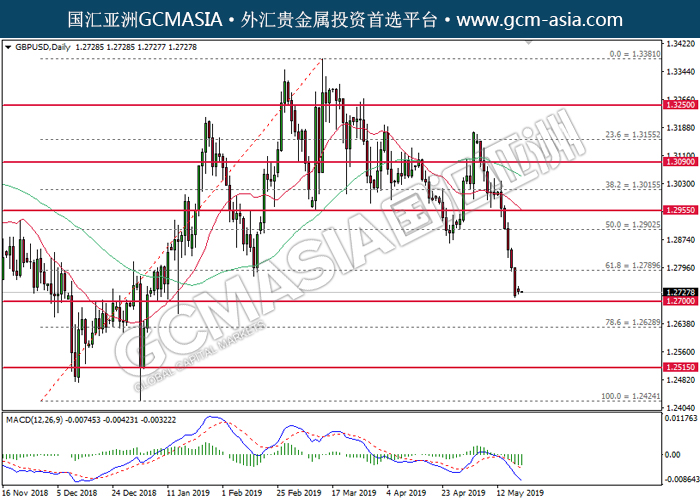 GBPUSD,Daily:镑美空头排列,目前测试前期支撑。MACD依然显示空头信号,若下破可继续看空为主。上方关注1.2790压力和1.2900压力,下方关注1.2700支撑和1.2630支撑。