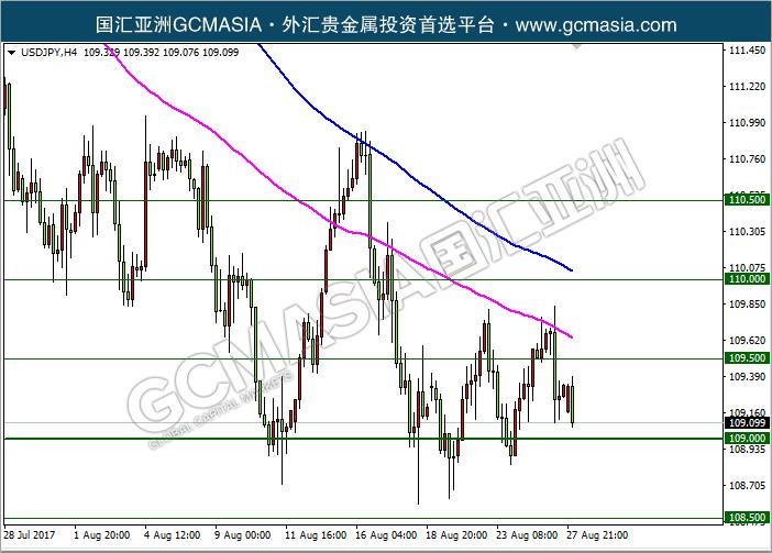 USDJPY H4:美日低位盘整,震荡走弱,空头偏强;目前继续下测前期低点支撑,仍有一定下行空间,短期关注空头势力为主,等待突破;上方关注109.5阻力和110阻力;下方关注109支撑和108.5支撑。