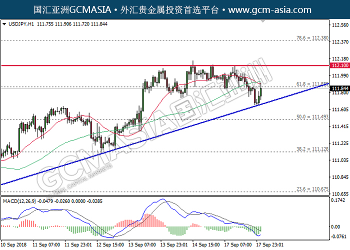 USDJPY,H1:美日低位反弹,目前测试前期压力。MACD动能转强,若突破压力位可继续看多。上方关注111.85压力和112.10压力,下方关注111.50支撑和111.10支撑。