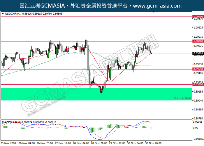 USDCHF,H1:美瑞受压力位承压回落。MACD开始形成死叉,动能略减,若收线于20日均线(红)下可继续看空。上方关注1.0000压力和1.0040压力,下方关注0.9955支撑和0.9930支撑。