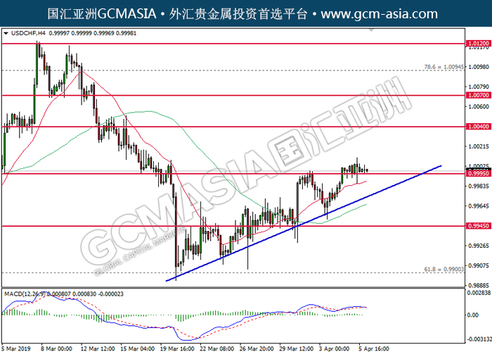 USDCHF,H4:美瑞震荡盘整,目前测试前期支撑。MACD多头动能有所略减,短期关注技术性回调。上方关注1.0040压力和1.0070压力,下方关注0.9995支撑和0.9945支撑。