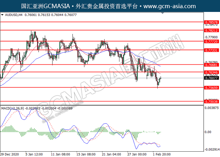 030221 AUDUSD by willy | Feb 3, 2021 | 澳元兑美元 | 0 comments GCMAsia-AUDUSD AUDUSD 2021-02-03 AUDUSD,H4:澳美低位反弹。MACD空头动能略增减,短期可关注多头为主。上方关注0.7635压力和0.7670压力,下方关注0.7565支撑和0.7505支撑。