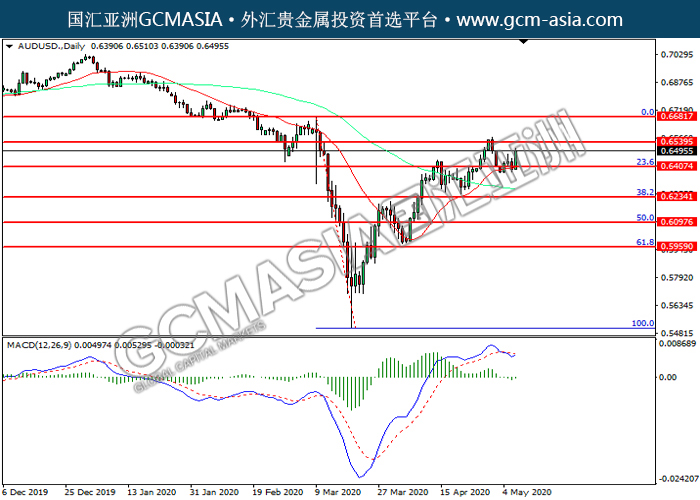 AUDUSD,Daily:澳美低位反弹。MACD空头动能略减,短期可关注多头为主。上方关注0.6540压力和0.6680压力,下方关注0.6405支撑和0.6235支撑。