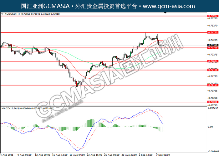 20210908 AUDUSD by willy | Sep 8, 2021 | 澳元兑美元 | 0 comments AUDUSD,H4:澳美震荡下行,目前测试前期支撑。MACD空头动能略增,若下破可关注空头为主。上方关注0.7475压力和0.7590压力,下方关注0.7175支撑和0.7280支撑。
