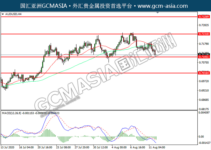 AUDUSD,H4:澳美震荡下行,目前测试前期支撑。MACD空头动能略增,若下破可关注空头为主。上方关注0.7230压力和0.7330压力,下方关注0.7105支撑和0.7015支撑。
