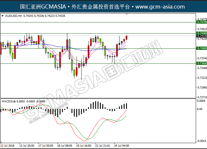 AUDUSD H4:澳美低位反弹,震荡上行,均线拐向,上方压制;目前测试上破前期的整点阻力,关注能否继续上破,若上破后市空间或将打开。上方关注0.7440压力和0.7470压力,下方关注0.7400支撑和0.7360支撑。
