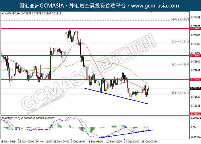 2018-12-19 AUDUSD by wind | Dec 19, 2018 | 澳元兑美元 | 0 comments GCM ASIA - AUDUSD AUDUSD 2018-12-19 AUDUSD,H4:澳美低位反弹。MACD依然显示牛背离信号,短期关注多头为主。上方关注0.7220压力和0.7265压力,下方关注0.7170支撑和0.7105支撑。