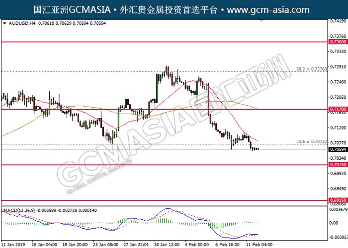 2019-02-12 AUDUSD by wind | Feb 12, 2019 | 澳元兑美元 | 0 comments GCM ASIA - AUDUSD AUDUSD 2019-02-12 AUDUSD,H4:澳美震荡下行。MACD多头动能有所略减,短期关注空头势力为主。上方关注0.7070压力和0.7170压力,下方关注0.7015支撑和0.6915支撑。