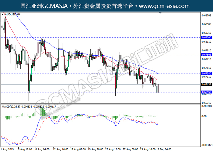 20190903 AUDUSD-午间 by keyk | Sep 3, 2019 | 澳元兑美元 | 0 comments GCMAsia - AUDUSD AUDUSD 2019-09-03 AUDUSD,H4:澳美低位反弹。MACD显示空头动能转弱,短期可关注反弹为主。上方关注0.6740压力和0.6780压力,下方关注0.6695支撑和0.6650支撑。