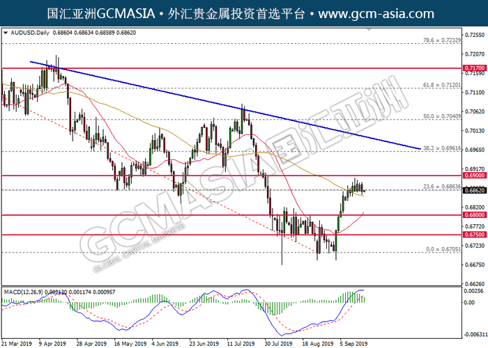 AUDUSD,Daily:澳美高位承压回落,目前测试前期支撑。MACD多头动能有所略减,若下破可继续看空。上方关注0.6900压力和0.6960压力,下方关注0.6865支撑和0.6800支撑。