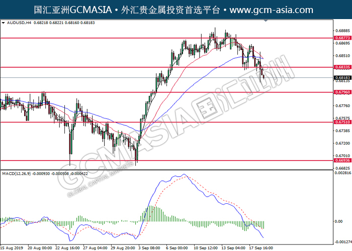 20190919 AUDUSD by skylow | Sep 19, 2019 | 澳元兑美元 | 0 comments GCMAsia - AUDUSD AUDUSD 2019-09-19 AUDUSD,H4:澳美突破后持续下行。MACD转于空头,动能略减,短期可继续看空。上方关注0.6835压力和0.6875压力,下方关注0.6795支撑和0.6750支撑。