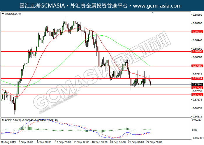 20190930 AUDUSD-午间 by keyk | Sep 30, 2019 | 澳元兑美元 | 0 comments GCMAsia - AUDUSD AUDUSD 2019-09-30 AUDUSD, H4: 澳美高位回落。MACD多头动能略减,短期关注空头为主。上方关注0.6760压力和0.6790压力,下方关注0.6745支撑和0.6725支撑。