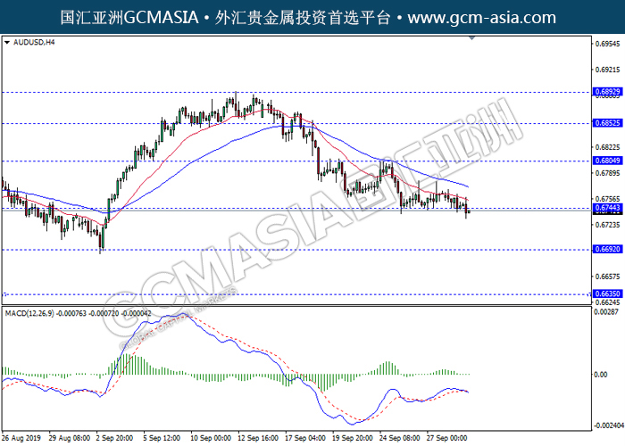 AUDUSD,H4:澳美震荡下行,目前测试前期压力位。MACD多头动能有所略减,若下破可关注空头为主。上方关注0.6745压力和0.6805压力,下方关注0.6690支撑和0.6635支撑。