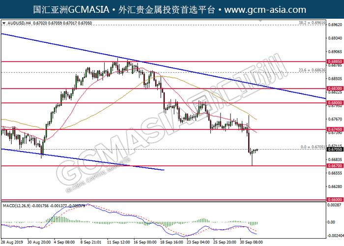 AUDUSD,H4:澳美低位反弹,目前测试前期压力。MACD空头动能有所略减,若上破可关注技术性回调。上方关注0.6705压力和0.6745压力,下方关注0.6670支撑和0.6600支撑。