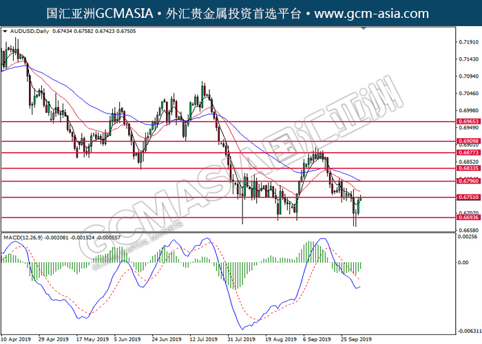 AUDUSD,Daily:澳美低位反弹,目前测试着压力位。MACD转于多头,动能略增,若上破可继续看多。上方关注0.6750压力和0.6795压力,下方关注0.6695支撑和0.6635支撑。