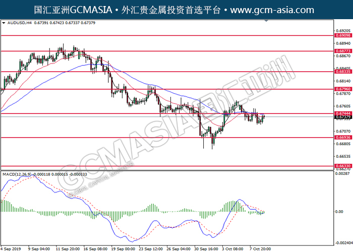 AUDUSD,H4:澳美低位反弹,目前测试压力。MACD慢转多头,空头动能略减,若突破可继续关注多头走势为主。上方关注0.6745压力和0.6795压力,下方关注0.6695支撑和0.6635支撑。