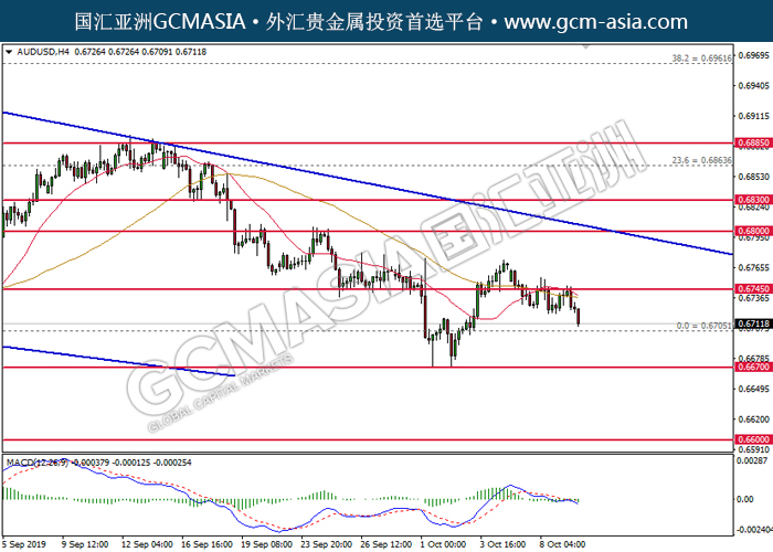 AUDUSD,H4:澳美震荡下行,目前测试前期支撑。MACD已形成死叉,动能偏弱,若下破可继续看空。上方关注0.6745压力和0.6800压力,下方关注0.6705支撑和0.6670支撑。