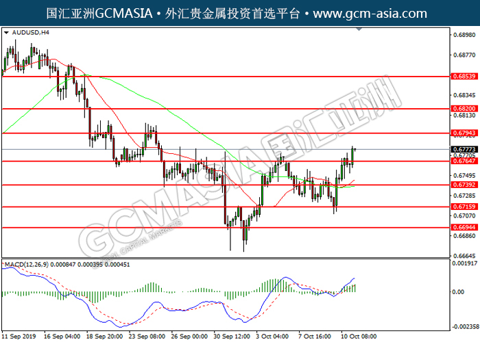 20191011 AUDUSD-午间 by keyk | Oct 11, 2019 | 澳元兑美元 | 0 comments GCMAsia - AUDUSD AUDUSD 2019-10-11 AUDUSD,H4:澳美突破前期压,震荡上行。MACD动能持续略增,中期继续看多为主。上方关注0.6795压力和0.6820压力,下方关注0.6765支撑和0.6740支撑。