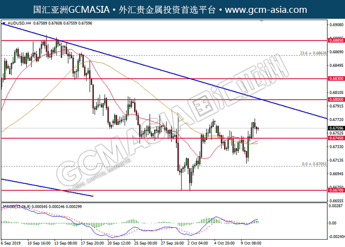 20191011 AUDUSD by willy | Oct 10, 2019 | 澳元兑美元 | 0 comments GCMAsia - AUDUSD AUDUSD 2019-10-11 AUDUSD,H4:澳美承压回落。MACD多头动能有所略减,短期关注空头势力为主。上方关注0.6800压力和0.6830压力,下方关注0.6745支撑和0.6705支撑。