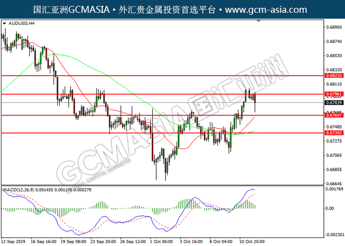 20191014 AUDUSD-午间 by skylow | Oct 14, 2019 | 澳元兑美元 | 0 comments GCMAsia - AUDUSD AUDUSD 2019-10-14 AUDUSD, H4: 澳美高位承压后回落。MACD多头动能略减,短期可关注空头为主。上方关注0.6795压力和0.6825压力,下方关注0.6765支撑和0.6740支撑。