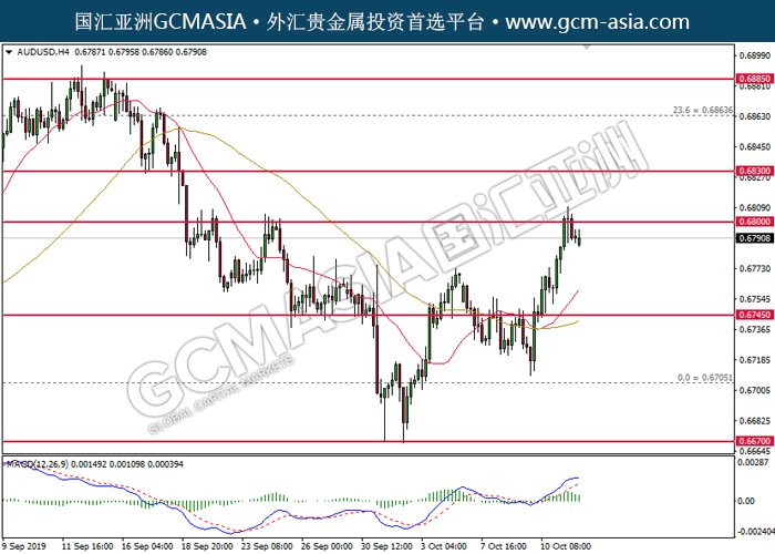 20191014 AUDUSD by willy | Oct 13, 2019 | 澳元兑美元 | 0 comments GCMAsia - AUDUSD AUDUSD 2019-10-14 AUDUSD,H4:澳美受承压回落。MACD多头动能有所略减,短期关注技术性回调。上方关注0.6800压力和0.6830压力,下方关注0.6745支撑和0.6705支撑。