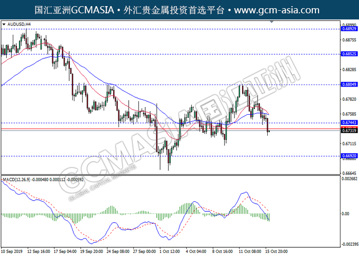 20191016 AUDUSD-午间 by keyk | Oct 16, 2019 | 澳元兑美元 | 0 comments GCMAsia - AUDUSD AUDUSD 2019-10-16 AUDUSD,H4:澳美突破前期支撑,空头排列。MACD动能继续略减,中期继续看空为主。上方关注0.6745压力和0.6805压力,下方关注0.6690支撑和0.6635支撑。