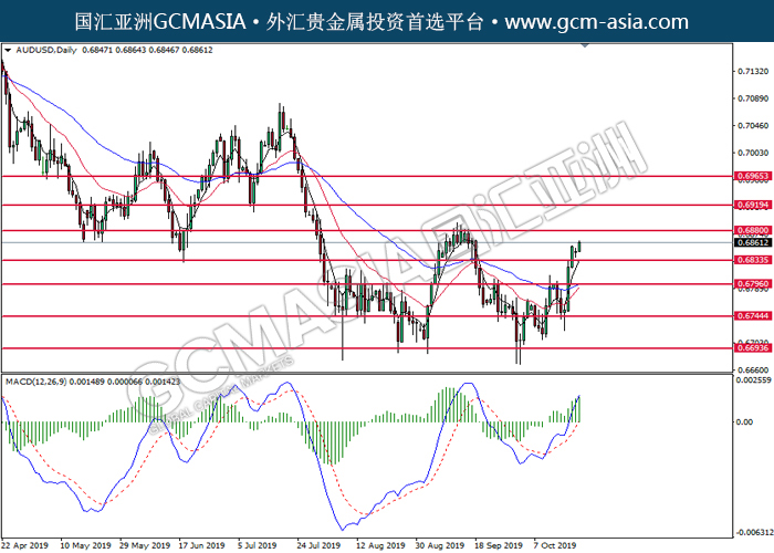 20191021 AUDUSD-午间 by skylow | Oct 21, 2019 | 澳元兑美元 | 0 comments GCMAsia - AUDUSD AUDUSD 2019-10-21 AUDUSD,Daily:澳美突破后持续上行。MACD多头动能仍偏强,短期关注多头为主。上方关注0.6880压力和0.6920压力,下方关注0.6835支撑和0.6795支撑。