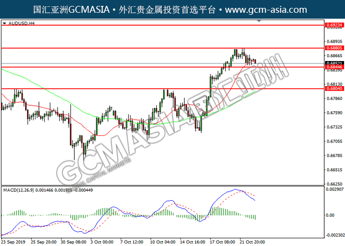 AUDUSD,H4:澳美震荡下行,目前测试前期支撑。MACD已形成死叉,动能偏弱,若下破可继续看空。上方关注0.6880压力和0.6925压力,下方关注0.6845支撑和0.6805支撑。