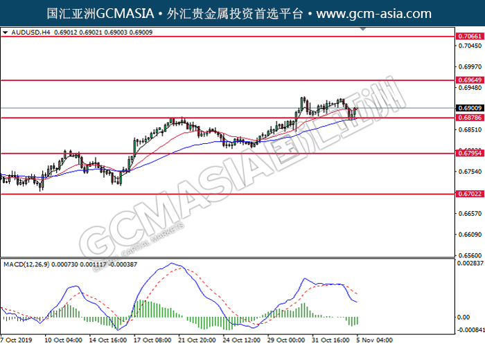 20191105 AUDUSD-午间 by keyk | Nov 5, 2019 | 澳元兑美元 | 0 comments GCMAsia - AUDUSD AUDUSD 2019-11-05 AUDUSD, H4: 澳美低位反弹。MACD空头动能略减,短期可关注多头为主。上方关注0.6965压力和0.7065压力,下方关注0.6880支撑和0.6795支撑。