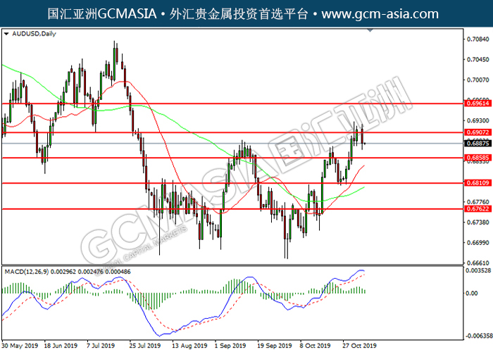 20191105 AUDUSD by willy | Nov 5, 2019 | 澳元兑美元 | 0 comments GCMAsia - AUDUSD AUDUSD 2019-11-05 AUDUSD, Daily: 澳美高位承压回落。MACD多头动能略减,短期可关注空头为主。上方关注0.6905压力和0.6960压力,下方关注0.6860支撑和0.6810支撑。
