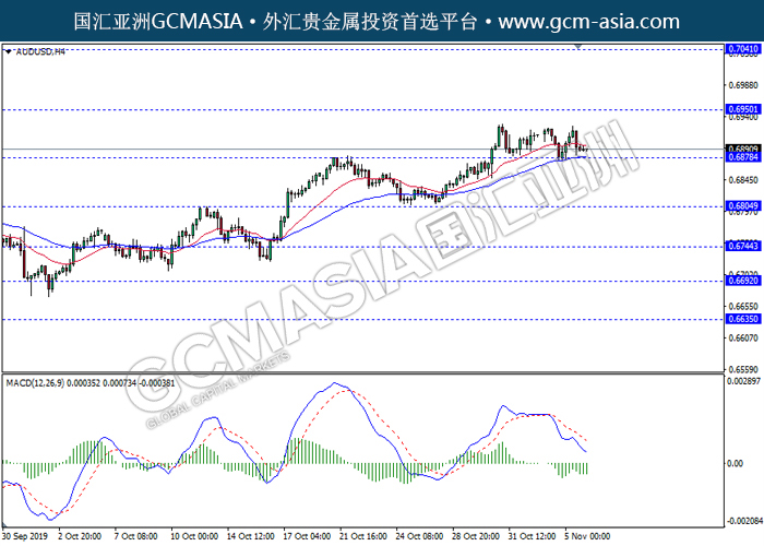 AUDUSD, H4: 澳美高位回落,目前测试靠近前期支撑。MACD动能略减,若突破继续看空为主。上方关注0.6950压力和0.7040压力,下方关注0.6880支撑和0.6805支撑。