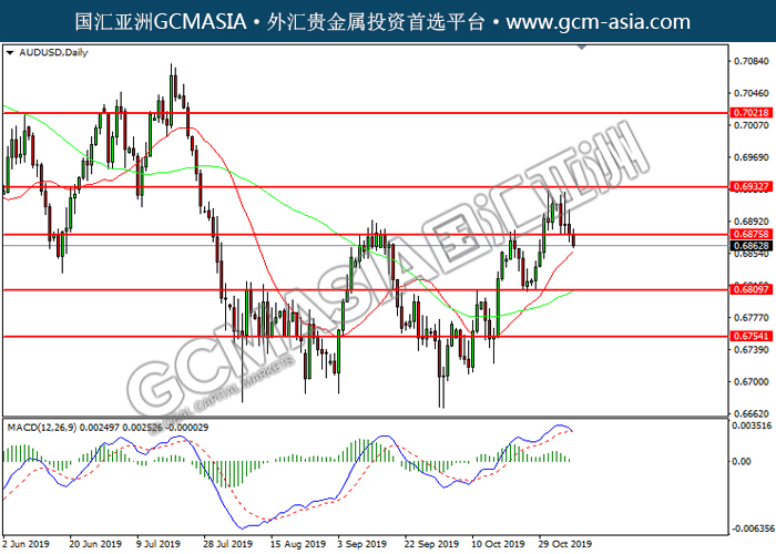 20191107 AUDUSD-午间 by skylow | Nov 7, 2019 | 澳元兑美元 | 0 comments GCMAsia - AUDUSD AUDUSD 2019-11-07 AUDUSD,Daily:澳美突破后持续下跌。MACD多头动能略减,短期关注空头势力。上方关注0.6875压力和0.6930压力,下方关注0.6810支撑和0.6755支撑。