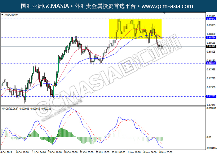 AUDUSD, H4: 澳美突破前期支撑后盘整。然而,MACD空头动能有所略减,短期关注多头反弹走势为主。上方关注0.6875压力和0.6925压力,下方关注0.6810支撑和0.6725支撑。