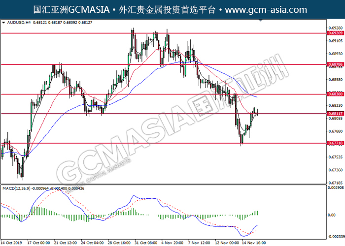 AUDUSD,H4:澳美高位承压后回落,目前测试着支撑位。但MACD仍显示动能偏强,短期可关注反弹模式为主。上方关注0.6840压力和0.6880压力,下方关注0.6810支撑和0.6770支撑。
