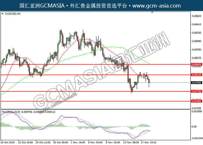 20191119 AUDUSD-午间 by keyk | Nov 19, 2019 | 澳元兑美元 | 0 comments GCMAsia - AUDUSD AUDUSD 2019-11-19 AUDUSD,H4:澳美受承压回落。MACD多头动能有所略减,短期关注空头势力。上方关注0.6815压力和0.6840压力,下方关注0.6775支撑和0.6750支撑。