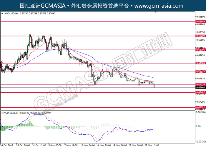 AUDUSD,H4:澳美震荡下行,目前测试着支撑位。MACD显示空头信号,若成功收线于支撑位下方可持续关注空头走势为主。上方关注0.6810压力和0.6840压力,下方关注0.6770支撑和0.6750支撑。