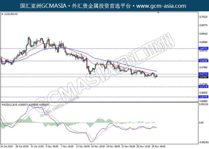 AUDUSD, H4: 澳美突破前期支撑,震荡下行。MACD显示空头,多头动能略减,短期继续看空为主。上方关注0.6770压力和0.6825压力,下方关注0.6720支撑和0.6675支撑。