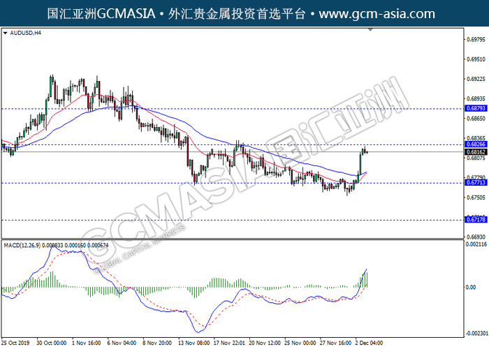 AUDUSD, H4: 澳美多头排列,目前测试靠近前期压力。MACD动能略增,若突破继续看多为主短期继续看空为主。上方关注0.6825压力和0.6880压力,下方关注0.6770支撑和0.6715支撑。