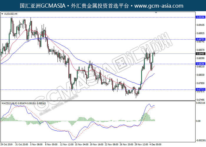 AUDUSD, H4: 澳美触底反弹上行。然而,MACD多头动能略减,短期关注空头回调趋势为主。上方关注0.6880压力和0.6925压力,下方关注0.6825支撑和0.6770支撑。