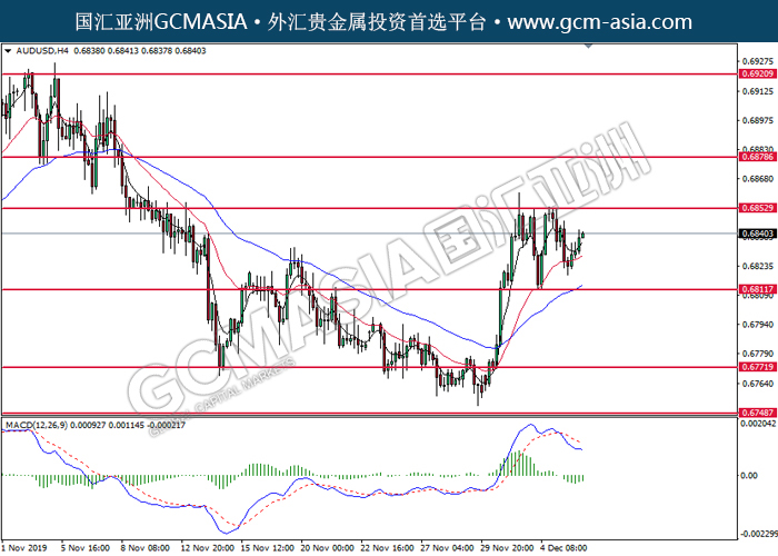 20191206 AUDUSD-午间 by skylow | Dec 6, 2019 | 澳元兑美元 | 0 comments GCMAsia - AUDUSD AUDUSD 2019-12-06 AUDUSD, H4: 澳美低位反弹。MACD空头动能略减,短期关注多头反弹为主。上方关注0.6855压力和0.6880压力,下方关注0.6810支撑和0.6770支撑。