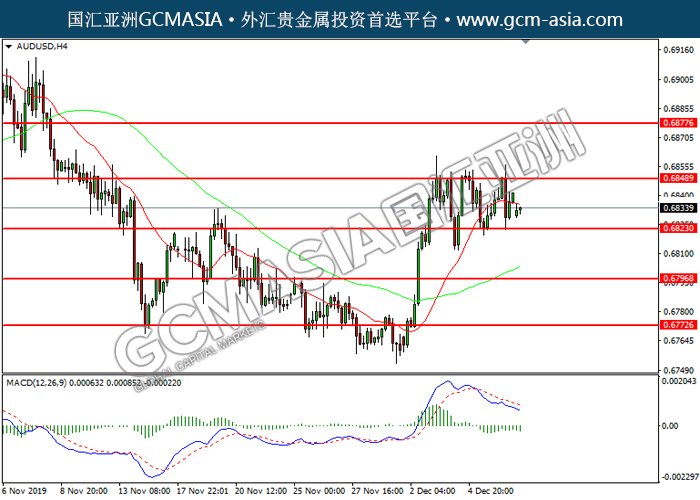 20191209 AUDUSD by skylow | Dec 9, 2019 | 澳元兑美元 | 0 comments GCMAsia - AUDUSD AUDUSD 2019-12-09 AUDUSD,H4:澳美震荡上行。然而,MACD空头动能略增,短期可关注空头为主。上方关注0.6850压力和0.6875压力,下方关注0.6825支撑和0.6795支撑。