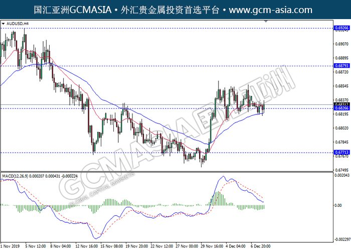 AUDUSD, H4: 澳美震荡下行,目前测试前期支撑。MACD动能持续略减,若突破继续看空为主。上方关注0.6880压力和0.6925压力,下方关注0.6825支撑和0.6770支撑。