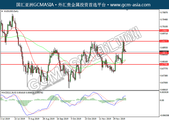 AUDUSD, Daily: 澳美高位承压回落,目前测试前期支撑。MACD多头动能有所略减,若下破可关注空头为主。上方关注0.6925压力和0.6985压力,下方关注0.6860支撑和0.6800支撑。