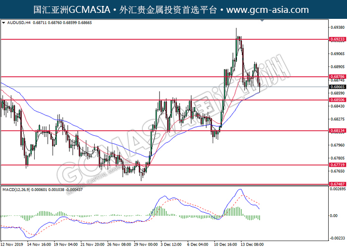 20191217 AUDUSD-午间 by skylow | Dec 17, 2019 | 澳元兑美元 | 0 comments GCMAsia - AUDUSD AUDUSD 2019-12-17 AUDUSD, H4: 澳美突破后持续下行。MACD空头动能偏强,短期可关注空头为主。上方关注0.6880压力和0.6925压力,下方关注0.6850支撑和0.6815支撑。