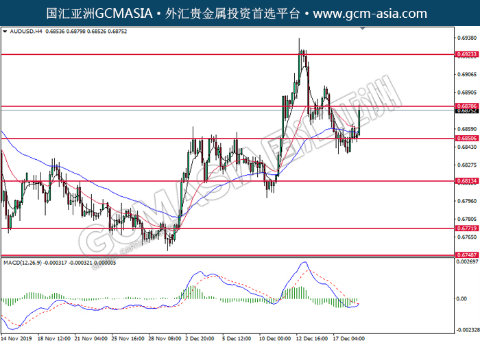 20191219 AUDUSD-午间 by skylow | Dec 19, 2019 | 澳元兑美元 | 0 comments GCMAsia - AUDUSD AUDUSD 2019-12-19 AUDUSD, H4: 澳美突破后持续上行。MACD空头动能持续略减,短期继续看多为主。上方关注0.6880压力和0.6925压力,下方关注0.6850支撑和0.6815支撑。