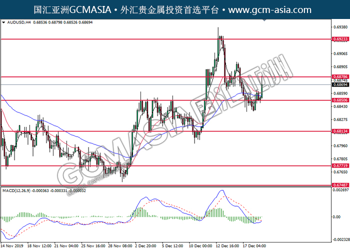 AUDUSD, H4: 澳美多头排列,目前测试前期压力。MACD空头动能略减,若突破可关注多头为主。上方关注0.6880压力和0.6925压力,下方关注0.6850支撑和0.6815支撑。