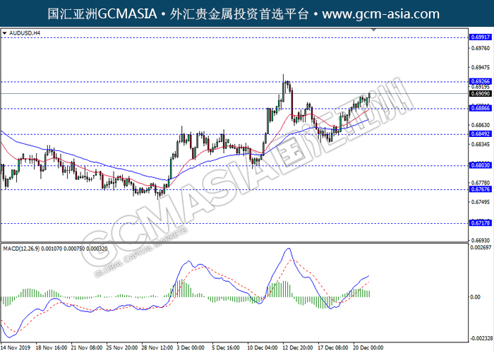 20191223 AUDUSD-午间 by keyk | Dec 23, 2019 | 澳元兑美元 | 0 comments GCMAsia - AUDUSD AUDUSD 2019-12-23 AUDUSD, H4: 澳美突破前期压力,多头排列。MACD动能持续略增,中期继续看多为主。上方关注0.6925压力和0.6990压力,下方关注0.6885支撑和0.6850支撑。