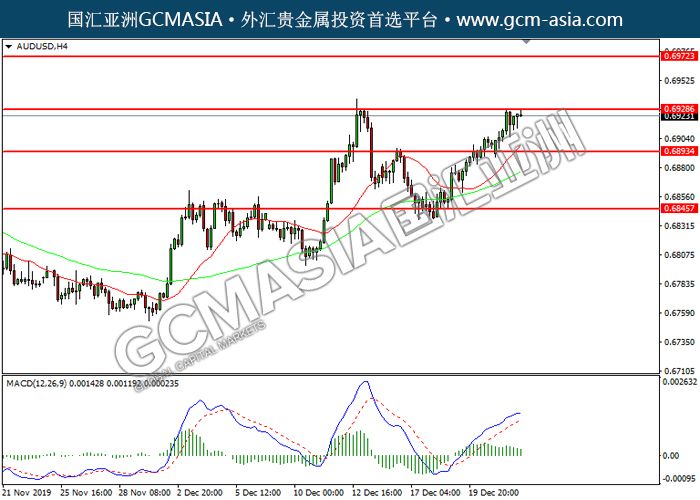 AUDUSD, H4: 澳美震荡上行,目前测试前期压力。然而,MACD多头动能略减,短期可关注技术性回调。上方关注0.6930压力和0.6970压力,下方关注0.6895支撑和0.6845支撑。