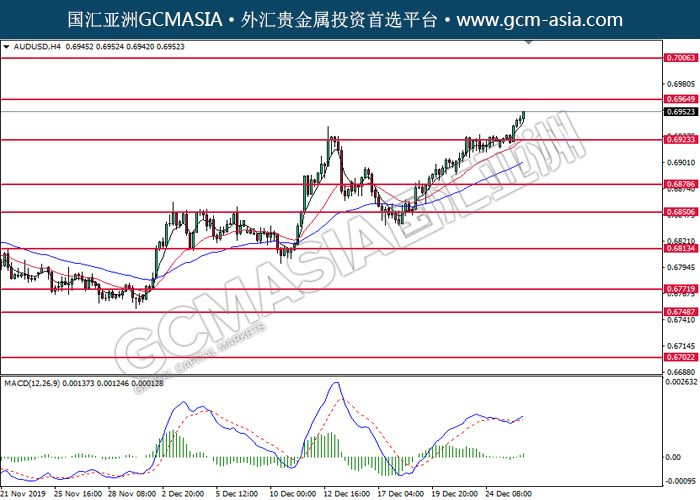 20191227 AUDUSD-午间 by skylow | Dec 27, 2019 | 澳元兑美元 | 0 comments GCMAsia - AUDUSD AUDUSD 2019-12-27 AUDUSD, H4: 澳美震荡上行。MACD多头动能略增,短期可关注多头为主。上方关注0.6965压力和0.7005压力,下方关注0.6925支撑和0.6880支撑。