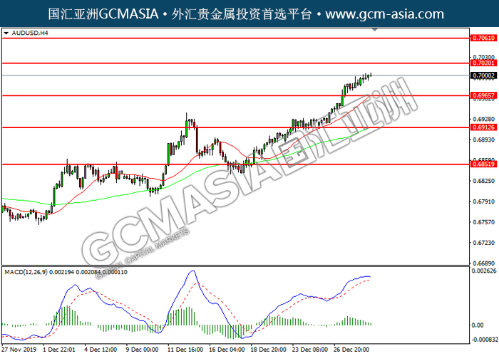 20191231 AUDUSD by willy | Dec 31, 2019 | 澳元兑美元 | 0 comments GCMAsia - AUDUSD AUDUSD 2019-12-31 AUDUSD, H4: 澳美震荡上行。然而,MACD多头动能略减,短期可关注技术性回调。上方关注0.7020压力和0.7060压力,下方关注0.6965支撑和0.6915支撑。